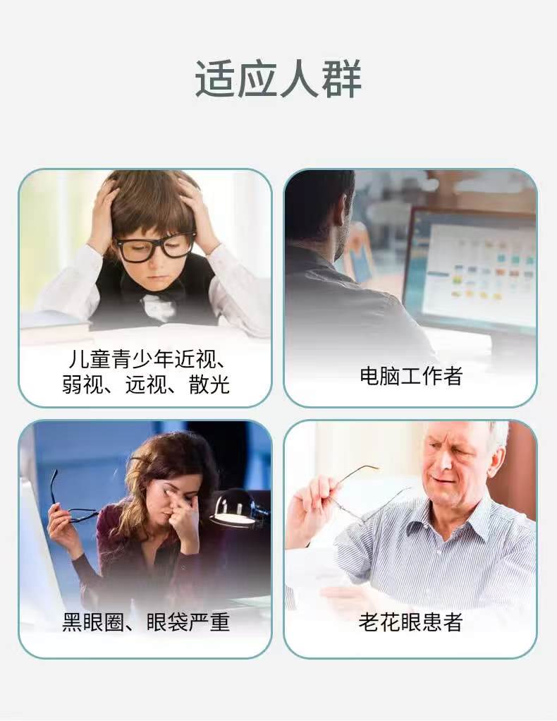 青少年近视弱视:由于青少年学生长时间写作阅读,很容易加深近视度数 成年人眼部样护:眼睛干涩、发痒、酸胀、疼痛、流泪、视物 模糊等 眼疲劳者:长期用眼过度引起的视疲劳者,祛眼袋、鱼尾纹、黑眼圈